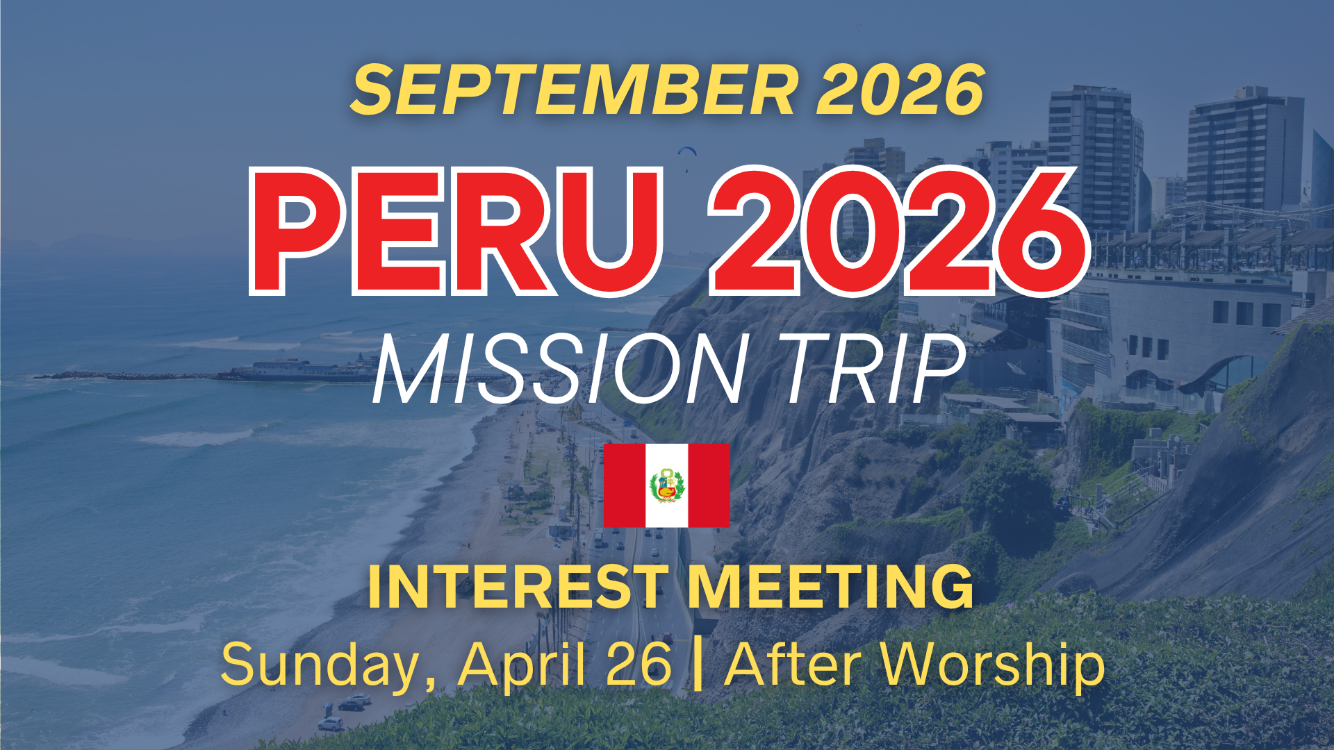 Peru 2026 Mission Trip Interest Meeting Apr 26 Peru 2026 Mission Trip Interest Meeting Featured 12:00 pm - 1:00 pm
