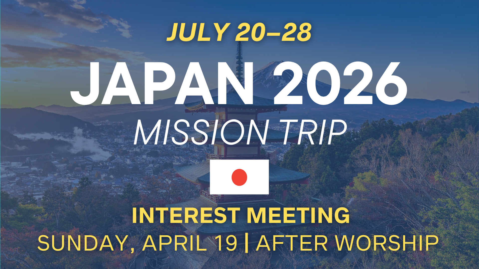 Japan 2026 Mission Trip Interest Meeting – 4/19 Apr 19 Japan 2026 Mission Trip Interest Meeting – 4/19 Featured 12:15 pm - 1:15 pm