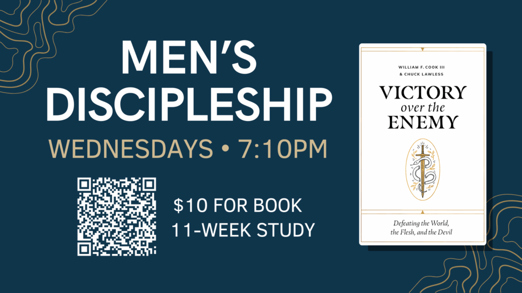 Join us for Men’s Discipleship on Wednesday nights! We are studying Victory Over the Enemy by William F. Cook III and Chuck Lawless. $10 for book.